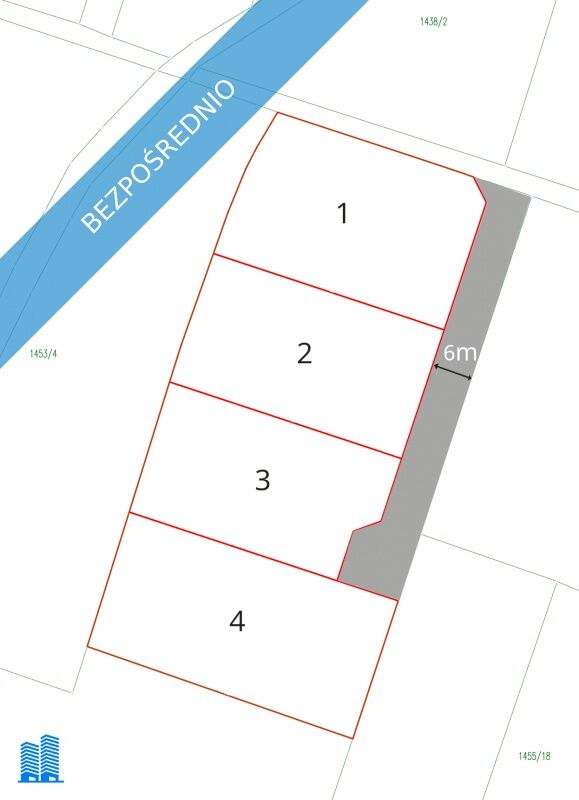 Dostępne działki zaznaczone na rysunku (wstępny podział działki 1453/1):